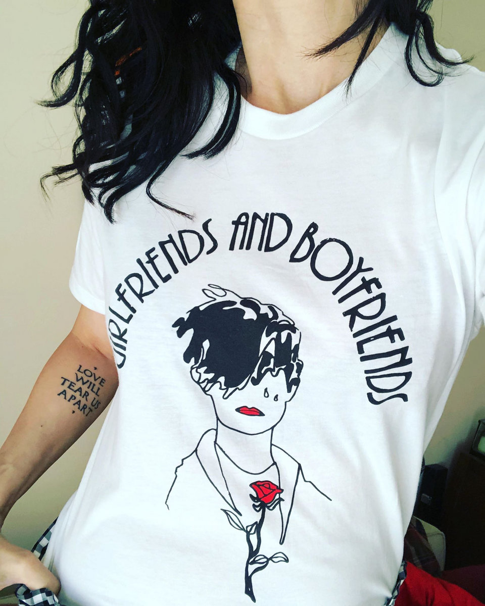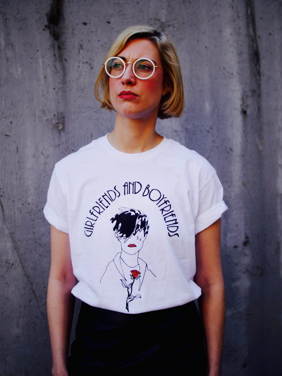 Designed by Jody Jessop. 100% ringspun cotton, white, slim fit. Available in unisex S/M/L/XL. Model: Bianca Barr.